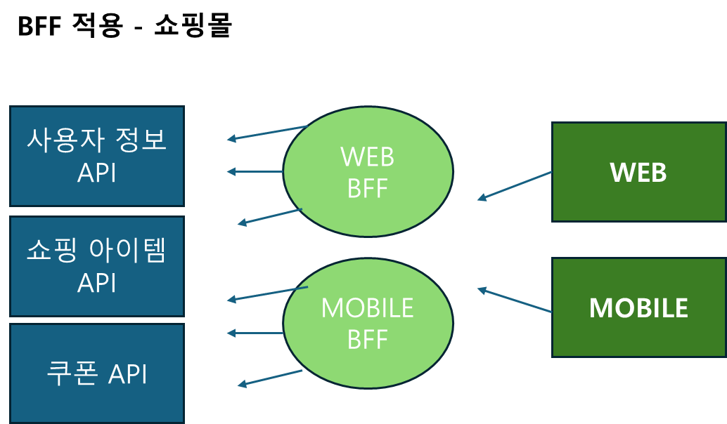 각 클라이언트(Web, Android, iOS 등)가 자기만의 백엔드를 가지고, 거기서 필요한 데이터만 받아서 쓴다.