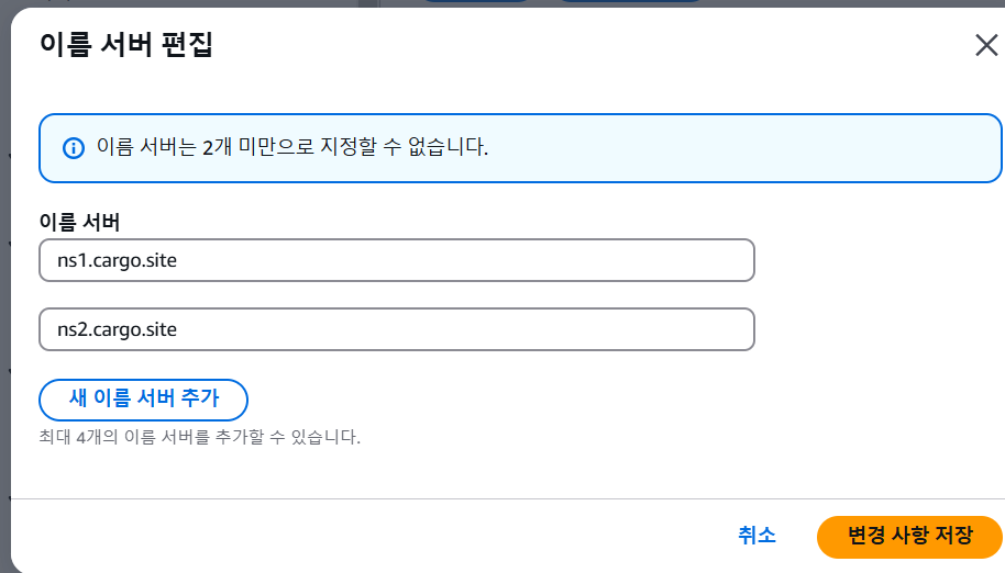 - 기존 NS(Name Server) 항목을 아래처럼 변경한다:
